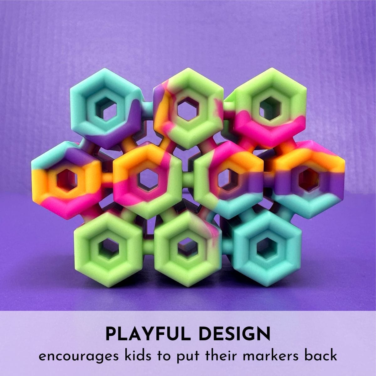 When they're ready to draw, your child grabs the body of the marker (not including the cap) and pulls it straight out. Marker Parker will grip the cap so it stays in place while your child draws with the marker. When they're done using the marker, they'll place it back in the cap.